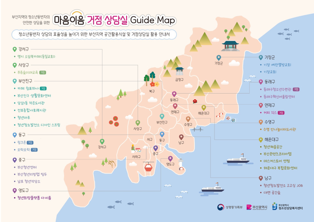 청소년동반자 상담의 효율성을 높이기 위하여 부산지역 내 공간활용시설 및 거점상담실 이용에 대해 안내드립니다.
