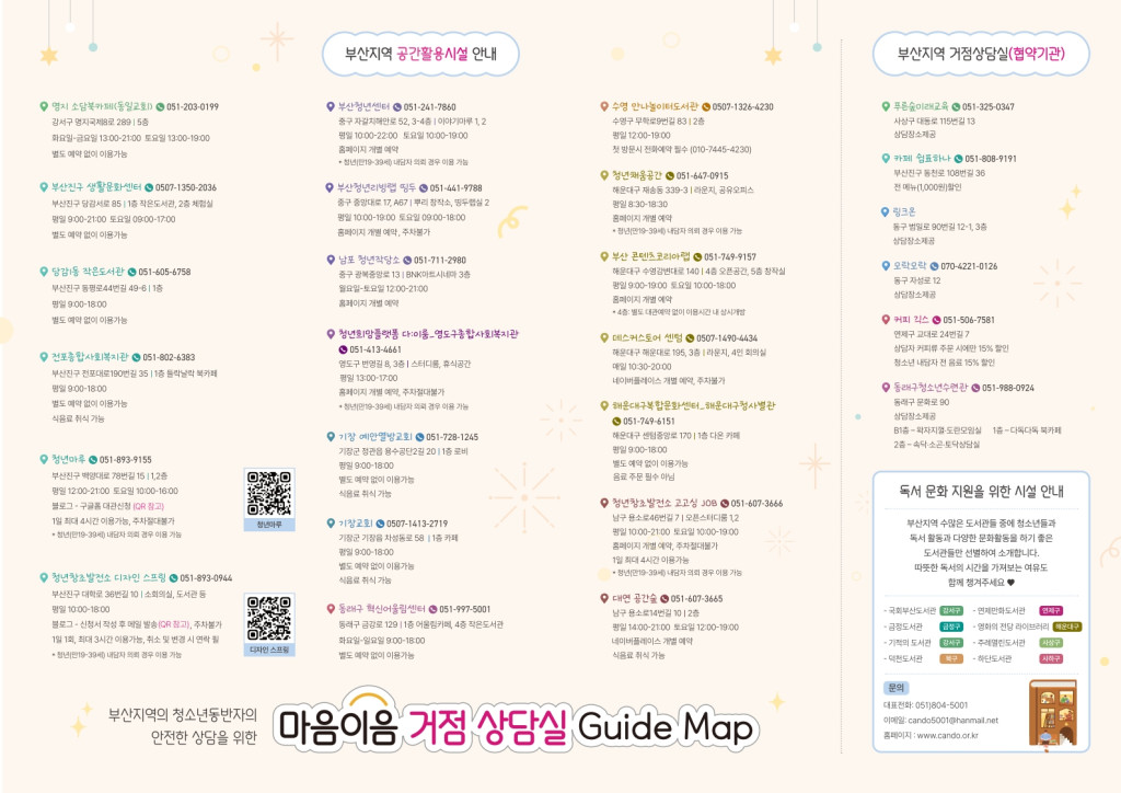 청소년동반자 상담의 효율성을 높이기 위하여 부산지역 내 공간활용시설 및 거점상담실 이용에 대해 안내드립니다.